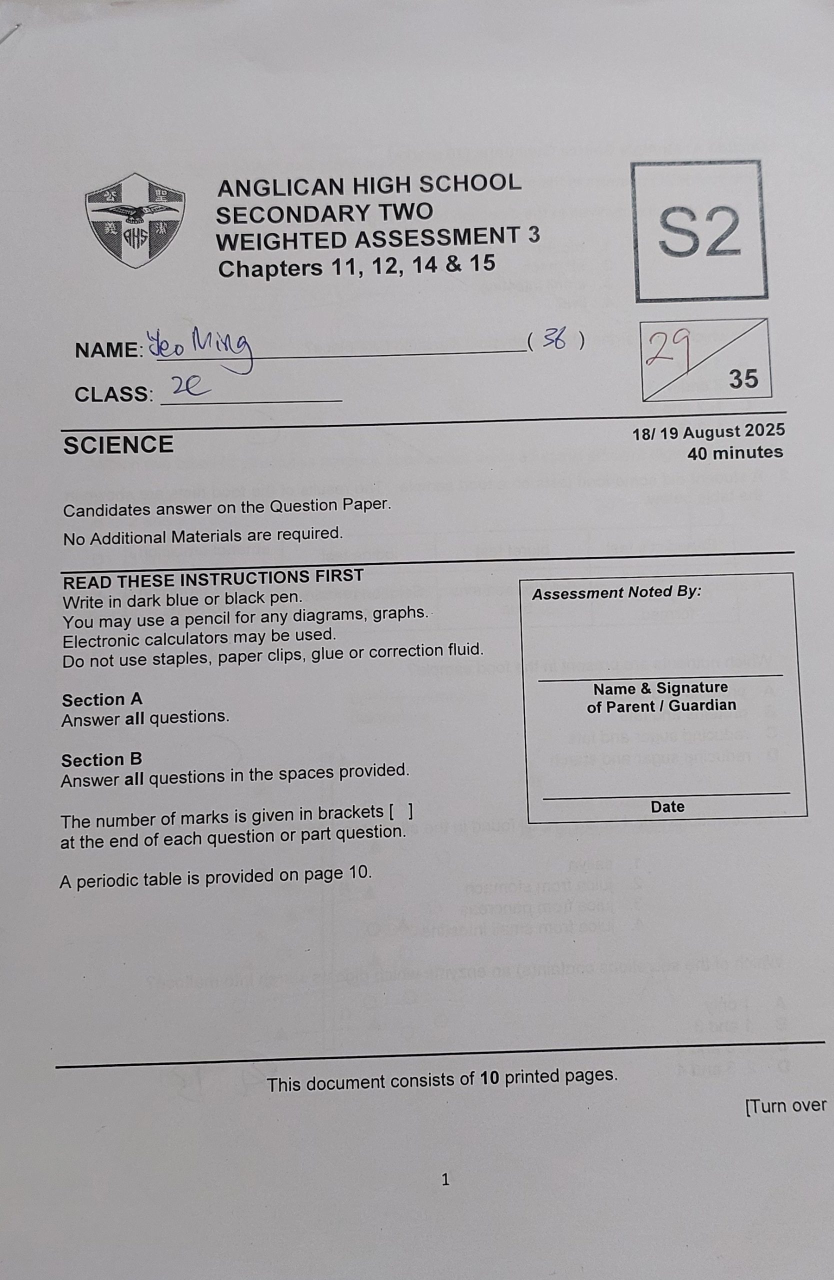 Yeo Ming Secondary Two Anglican High WA 3 Science